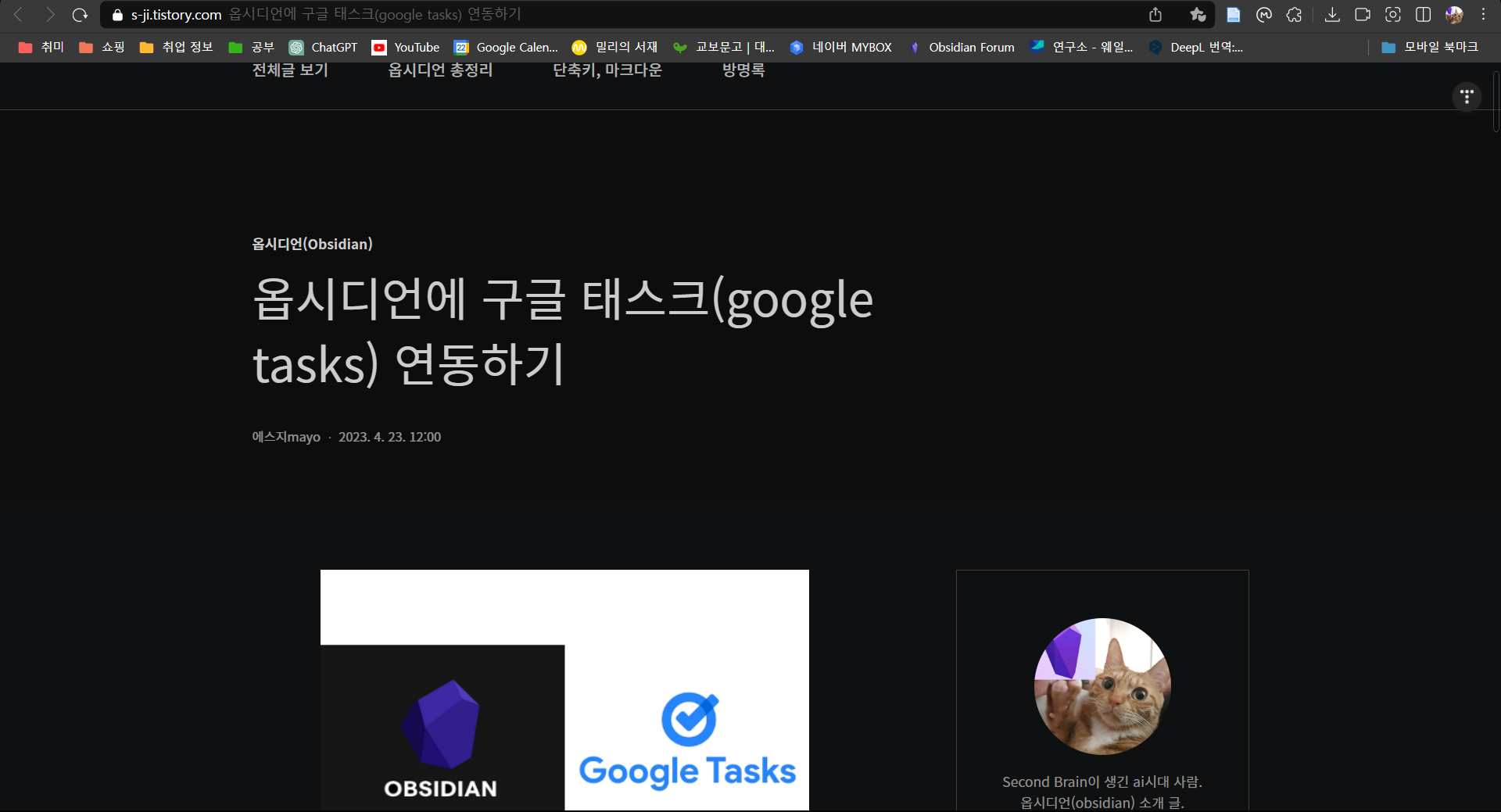 | 내가 옵시디언을 선택한 이유, 티스토리 글을 쓰게 된 과정.(최근에 떠올린 아이디어와 그 현재 진행 상태) (1) | 2023.04.26 |