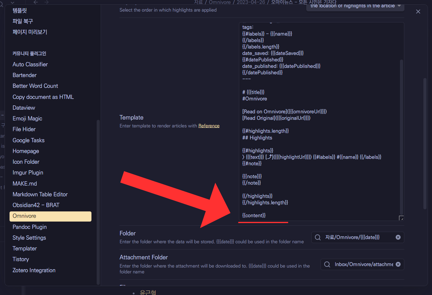 - 옵시디언에 스크랩의 전체 내용을 불러오고 싶을때 : 플러그인 설정 - 템플릿 제일 아래에 {{content}} 추가.