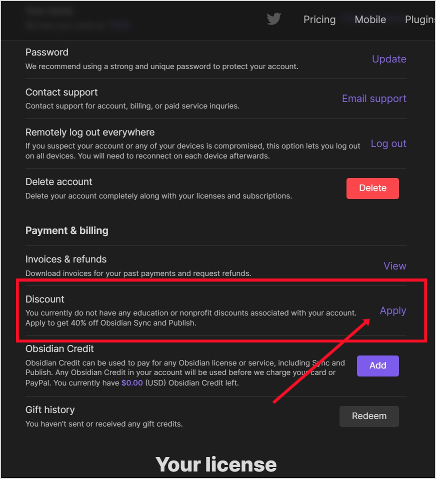 - 옵시디언 홈페이지 회원가입해서 로그인 후 상단 account탭 (회원가입할때는 웹메일 사용안하고 네이버같은거 써도 가능.)
