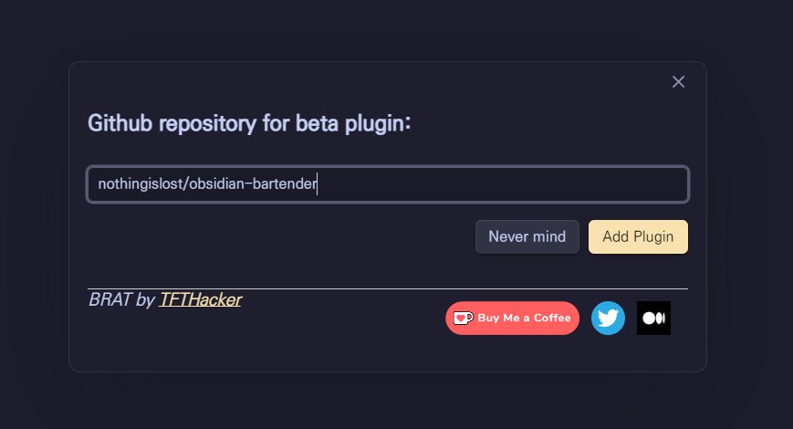2. brat 플러그인 설정에서 'add beta plugin'에 "nothingislost/obsidian-bartender"입력 후 bartender 설치.