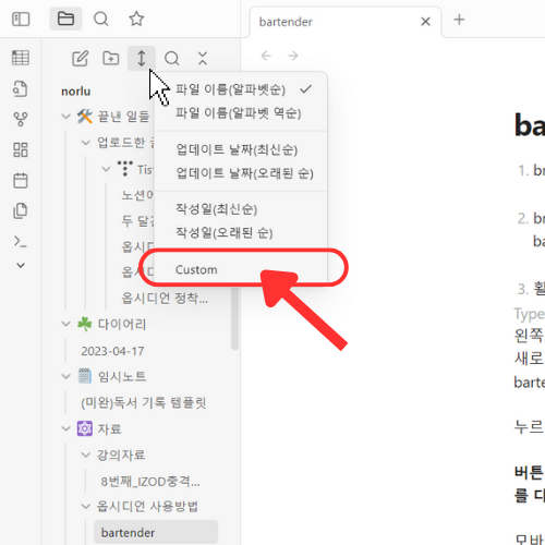 4. 왼쪽 탐색기에서 위아래 화살표 모양(정렬 순서 변경)을 누르고, 맨 아래 custom 정렬.